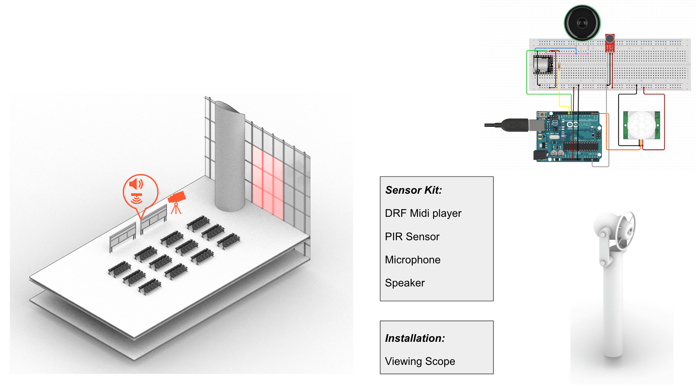 By simply putting a VR viewing scope optimized for high-traffic areas, the user is able to superimpose images on the existing architecture. These images are meant to blending seamlessly with the context to create a feeling of telepresence.